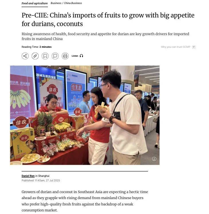 7月23日至29日,多家道表里为进博会“打call”,开展了普遍报道。第八届进博会送来倒计时100天、第八届虹桥论坛发布从题议题、进博会鞭策更多优良农产物对华出口等内容获普遍关心。小编拾掇了相关内容,一路来感触感染进博会的热度取活力!截至目前,第八届进博会已有跨越50个国度和国际组织确认加入国度展,此中,、阿联酋等国将担任从宾国,吉尔吉斯斯坦初次参展。企业贸易展方面,、马来西亚、、挪威、秘鲁等国参展企业规模创下汗青新高。近日举行的第八届进博会供需对接勾当上,多位参展商暗示,中国市场对优良农产物需求上升,进口量不竭扩大,本年将携新品种椰子和车厘子等生果产物表态进博会。