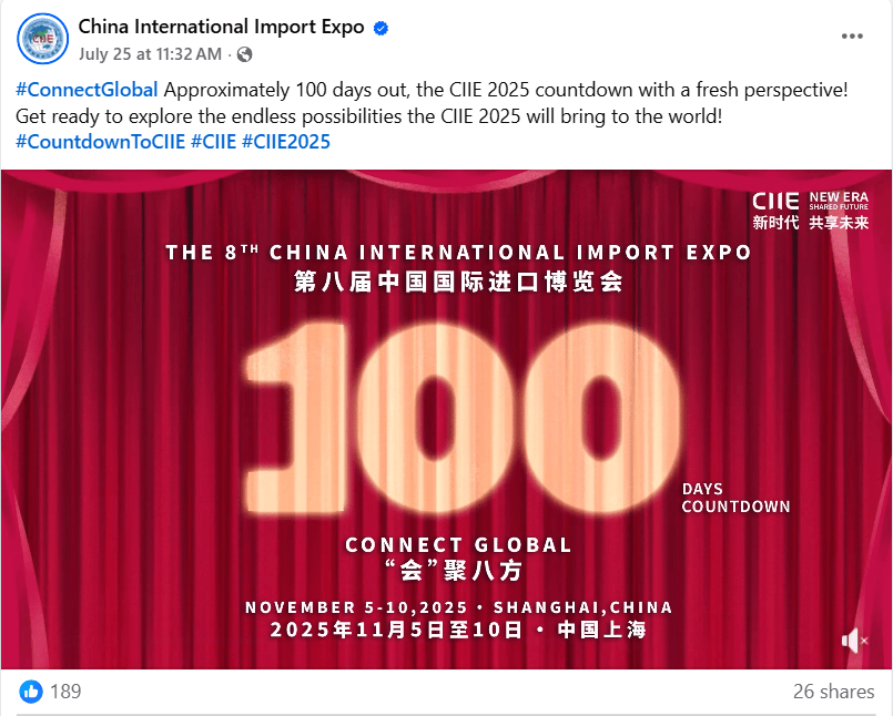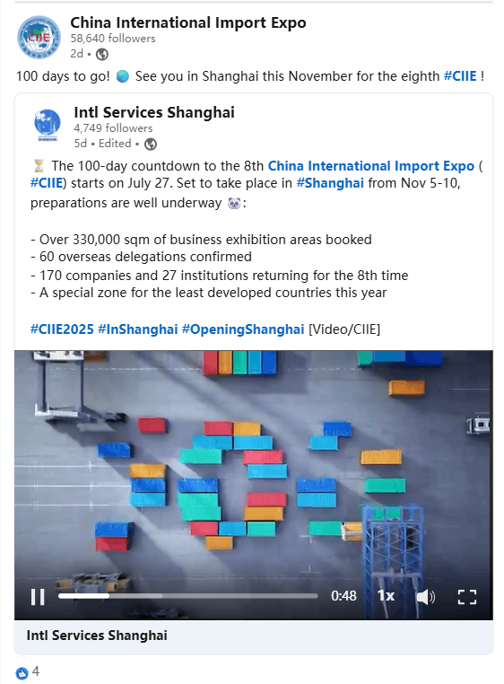 7月25日,上海市人平易近外事办公室海媒账号Intl Services Shanghai于Facebook、X、LinkedIn及TikTok平台发布进博会倒计时100天视频。进博会海媒账号点赞并转发,暗示等候正在上海取各方相会!
